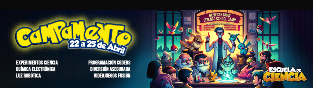 - Escuela de Ciencia: Cuatro laboratorios de entrenamiento especializados con experimentos, robótica, programación y ciencia. Al final del campamento conseguirás nuevos y exclusivos Pokémon de ciencia y tecnología. Para todos los niños y niñas de 1º Primaria a 2º ESO. Del 22 al 25 de abril de 9:00 a 14:00 horas. Más información.