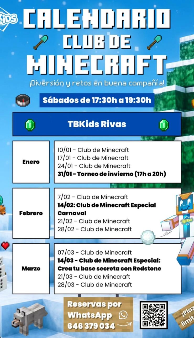 Este mes, destaca el Torneo de Invierno (31 de enero), una oportunidad única para poner en práctica la estrategia y la imaginación en un desafío colaborativo. Además, durante febrero y marzo se celebrarán actividades especiales como el Carnaval Minecraft y el taller Redstone, donde los asistentes aprenderán a crear mecanismos y circuitos dentro del juego, acercándose a principios básicos de ingeniería y robótica
