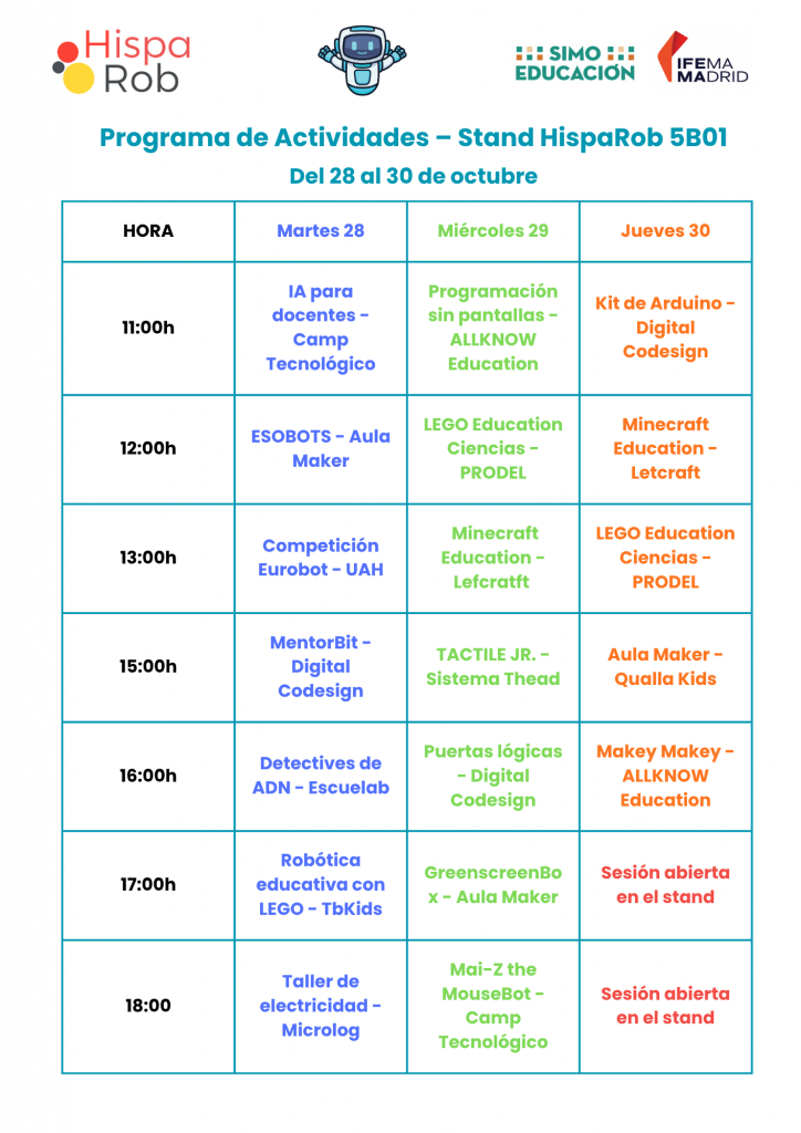 Durante los tres días de feria, HispaRob estará presente en el stand 5B01 del Pabellón 5, ofreciendo una amplia programación de talleres, charlas y actividades centradas en la innovación educativa y la integración de la robótica, la inteligencia artificial y la tecnología en el aula.
