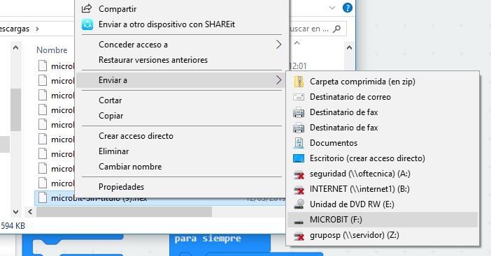 - Se nos genera un archivo ”.hex” que podremos localizar en la carpeta ”Descargas”. Pinchamos con el botón derecho del ratón nuestro archivo y seleccionamos ”Enviar a Microbit”.